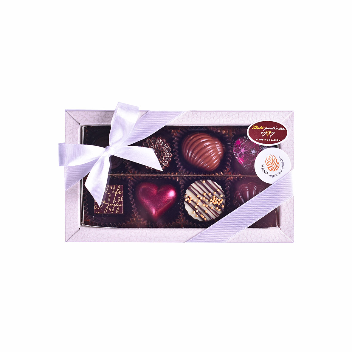 Krabička s hnědou výstélkou uvnitř, 8 pralinek, 100 g.
