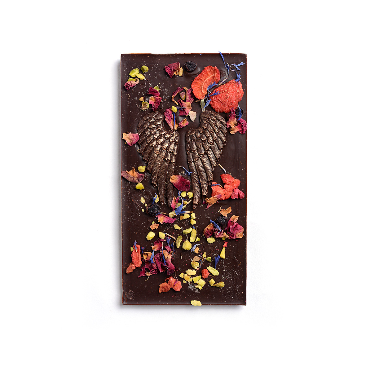 HOŘKÁ ČOKOLÁDA EXTRA 60% Složení: kakaová hmota,cukr, kakaové máslo, emulgátor: SÓJOVÝ lecitin, přírodní vanilkový extrakt. Obsah kakaové sušiny v čokoládové složce min. 60 %. Zdobení: HOŘKÁ ČOKOLÁDA EXTRA 60% (kakaová hmota, cukr, kakaové máslo, emulgátor: SÓJOVÝ lecitin, přírodní vanilkový extrakt. Obsah kakaové sušiny v čokoládové složce nejméně 60 %), pistáciové OŘÍŠKY, lyofilizované maliny, chrpa polní květ. Alergeny: sója, mléko, skořápkové plody.