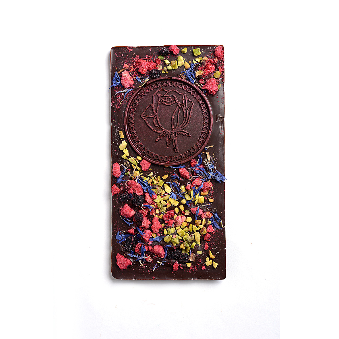 HOŘKÁ ČOKOLÁDA EXTRA 60% Složení: kakaová hmota, cukr, kakaové máslo, emulgátor: SÓJOVÝ lecitin, přírodní vanilkový extrakt. Obsah kakaové sušiny v čokoládové složce min. 60 %. Zdobení: HOŘKÁ ČOKOLÁDA EXTRA 60% (kakaová hmota, cukr, kakaové máslo, emulgátor: SÓJOVÝ lecitin, přírodní vanilkový extrakt. Obsah kakaové sušiny v čokoládové složce nejméně 60 %), pistáciové OŘÍŠKY, lyofilizované maliny, borůvky, chrpa polní květ. Alergeny: sója, mléko, skořápkové plody.