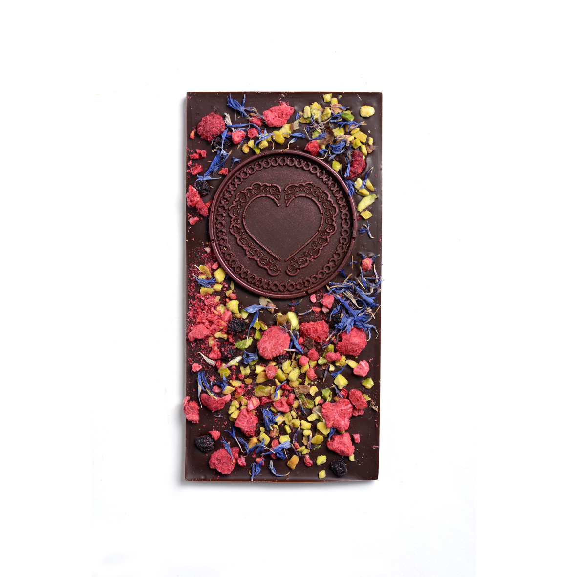 HOŘKÁ ČOKOLÁDA EXTRA 60% Složení: kakaová hmota, cukr, kakaové máslo, emulgátor: SÓJOVÝ lecitin, přírodní vanilkový extrakt. Obsah kakaové sušiny v čokoládové složce min. 60 %. Zdobení: HOŘKÁ ČOKOLÁDA EXTRA 60% (kakaová hmota, cukr, kakaové máslo, emulgátor: SÓJOVÝ lecitin, přírodní vanilkový extrakt. Obsah kakaové sušiny v čokoládové složce nejméně 60 %), pistáciové OŘÍŠKY, lyofilizované maliny, borůvky, chrpa polní květ. Alergeny: sója, mléko, skořápkové plody.