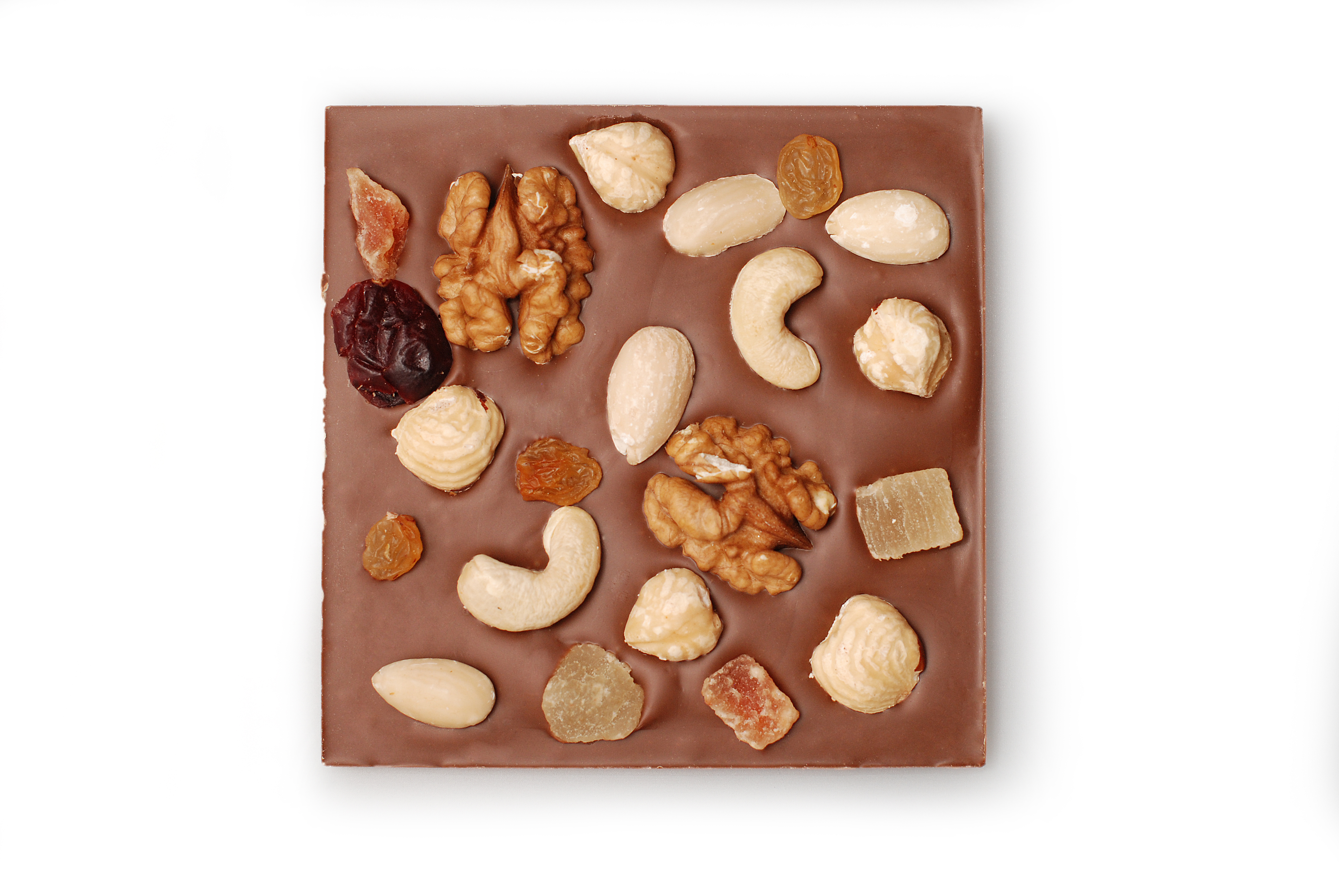 MLÉČNÁ ČOKOLÁDA EXTRA 36% Složení: cukr, sušené plnotučné MLÉKO, kakaové máslo a kakaová hmota, emulgátor: SÓJOVÝ lecitin, přírodní vanilkový extrakt. Obsah kakaové sušiny v čokoládové složce min 36%. Zdobení: vlašské a lískové OŘECHY, kešu, mandle, rozinky, kandované ovoce. Alergeny: sója, mléko, skořápkové plody, oxid siřičitý.