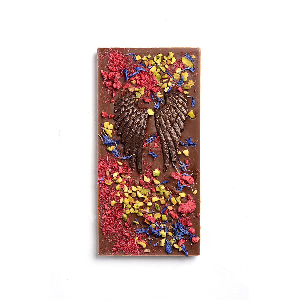 MLÉČNÁ ČOKOLÁDA EXTRA 36% Složení: cukr, sušené plnotučné MLÉKO, kakaové máslo a kakaová hmota, emulgátor: SÓJOVÝ lecitin, přírodní vanilkový extrakt. Obsah kakaové sušiny v čokoládové složce min. 36 %. Zdobení: HOŘKÁ ČOKOLÁDA EXTRA 60% Složení: kakaová hmota,cukr, kakaové máslo, emulgátor: SÓJOVÝ lecitin, přírodní vanilkový extrakt. Obsah kakaové sušiny v čokoládové složce min. 60 %, pistáciové OŘÍŠKY, lyofilizované maliny, chrpa polní květ. Alergeny: sója, mléko, skořápkové plody.