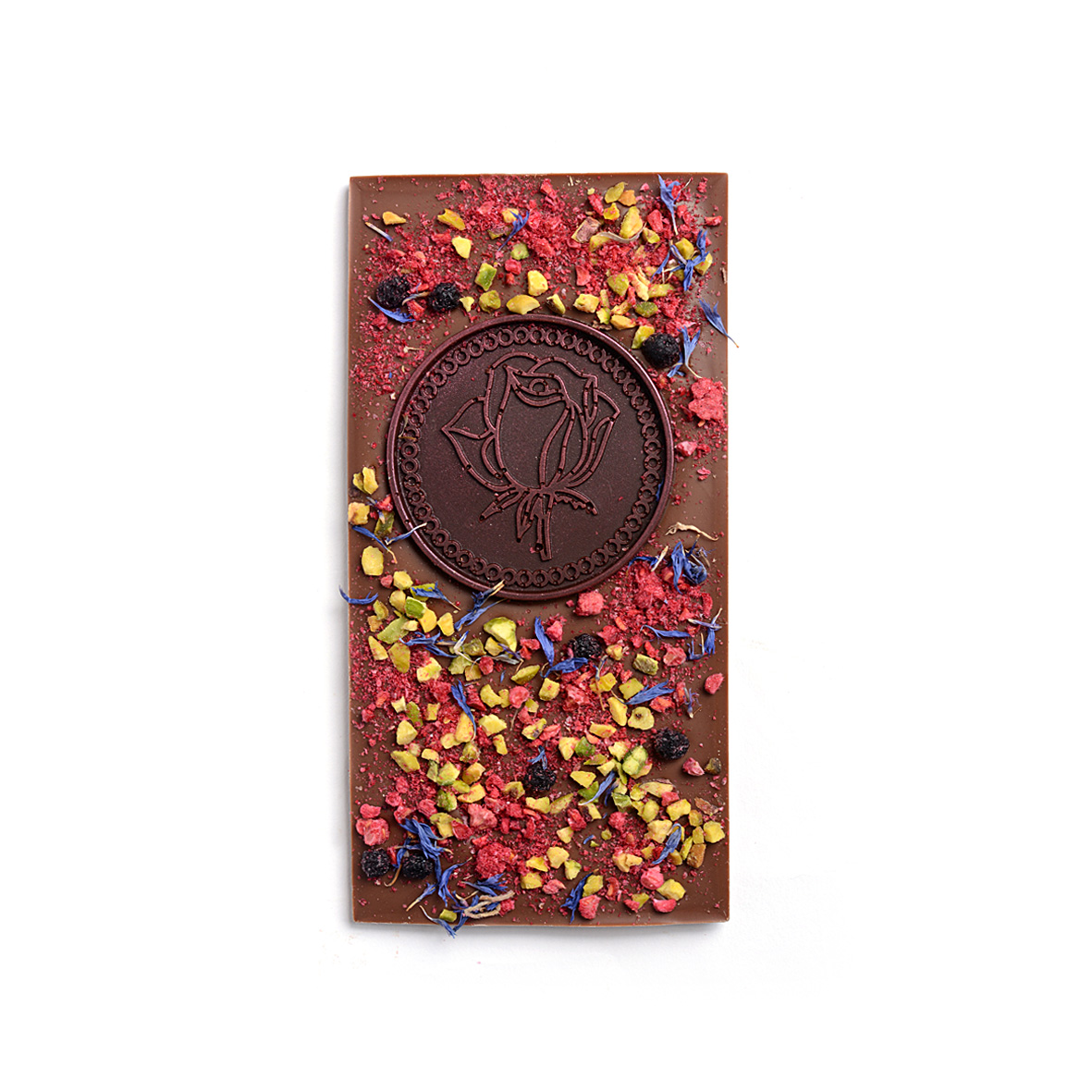 MLÉČNÁ ČOKOLÁDA EXTRA 36% Složení: cukr, sušené plnotučné MLÉKO, kakaové máslo a kakaová hmota, emulgátor: SÓJOVÝ lecitin, přírodní vanilkový extrakt. Obsah kakaové sušiny v čokoládové složce min. 36 %. Zdobení: HOŘKÁ ČOKOLÁDA EXTRA 60% Složení: kakaová hmota, cukr, kakaové máslo, emulgátor: SÓJOVÝ lecitin, přírodní vanilkový extrakt. Obsah kakaové sušiny v čokoládové složce min. 60 %. Pistáciové OŘÍŠKY, lyofilizované maliny, borůvky, chrpa polní květ. Alergeny: sója, mléko, skořápkové plody.