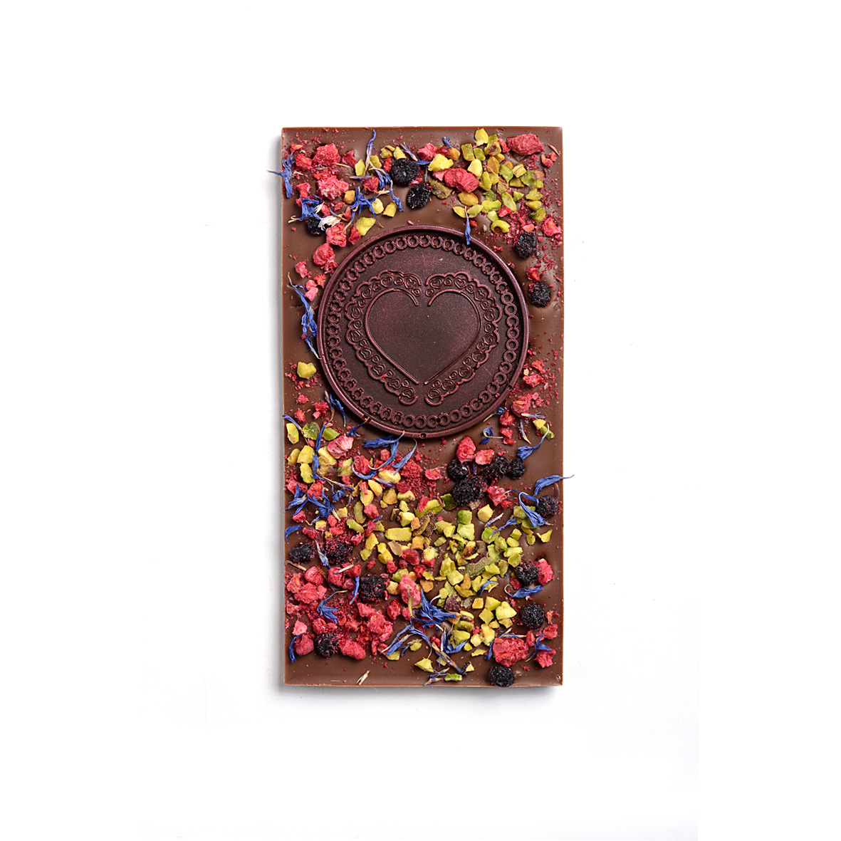 MLÉČNÁ ČOKOLÁDA EXTRA 36% Složení: cukr, sušené plnotučné MLÉKO, kakaové máslo a kakaová hmota, emulgátor: SÓJOVÝ lecitin, přírodní vanilkový extrakt. Obsah kakaové sušiny v čokoládové složce min. 36 %. Zdobení: HOŘKÁ ČOKOLÁDA EXTRA 60% Složení: kakaová hmota, cukr, kakaové máslo, emulgátor: SÓJOVÝ lecitin, přírodní vanilkový extrakt. Obsah kakaové sušiny v čokoládové složce min. 60 %. Pistáciové OŘÍŠKY, lyofilizované maliny, borůvky, chrpa polní květ. Alergeny: sója, mléko, skořápkové plody.