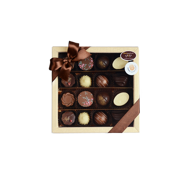 Krabička se 16 pralinkami. Tato bonboniera je se stuhou. Foto je ilustrační.